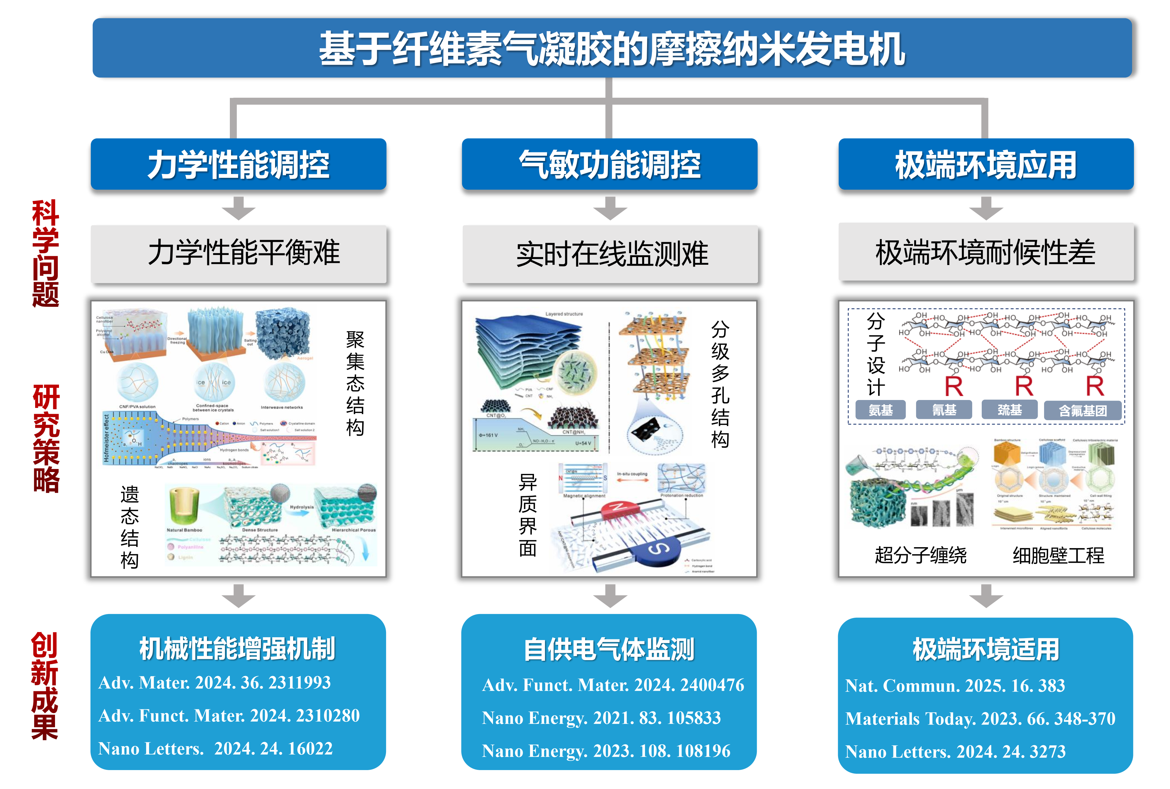 In recent years, under the leadership of Nie Shuangxi, the group has carried out systematic basic research on the construction and advanced application of paper-based functional materials, and put forward the research direction of “Frictional Nanogenerator Based on Cellulose Aerogel”, which solves the bottleneck problem of poor weathering resistance in harsh environments and difficult to improve mechanical properties of traditional friction materials. Through the strategies of cellulose aerogel aggregation structure regulation and interface engineering of wood relic structure, they analyzed the constitutive relationship between cellulose intermolecular force and mechanical properties, elucidated the energy dissipation mechanism of cellulose triboelectric aerogels, and broken through the problem that lightweight and high stiffness of the material are not compatible with each other. Through the strategies of heterogeneous interface engineering, hierarchical porous and self-assembly, they successfully endowed cellulose aerogels with gas-sensitive functions, realizing in situ real-time monitoring of gases such as ammonia and water vapor. Through the molecular design of cellulose, cell wall engineering, supramolecular entanglement and other strategies, the flame retardancy, thermal stability and water resistance of cellulose triboelectric aerogels have been significantly improved, realizing the effective application in extreme environments, such as high temperature, high humidity, strong light, low temperature and poisonous gases, and breaking through the difficult problem of the performance failure of the conventional materials in extreme environments.