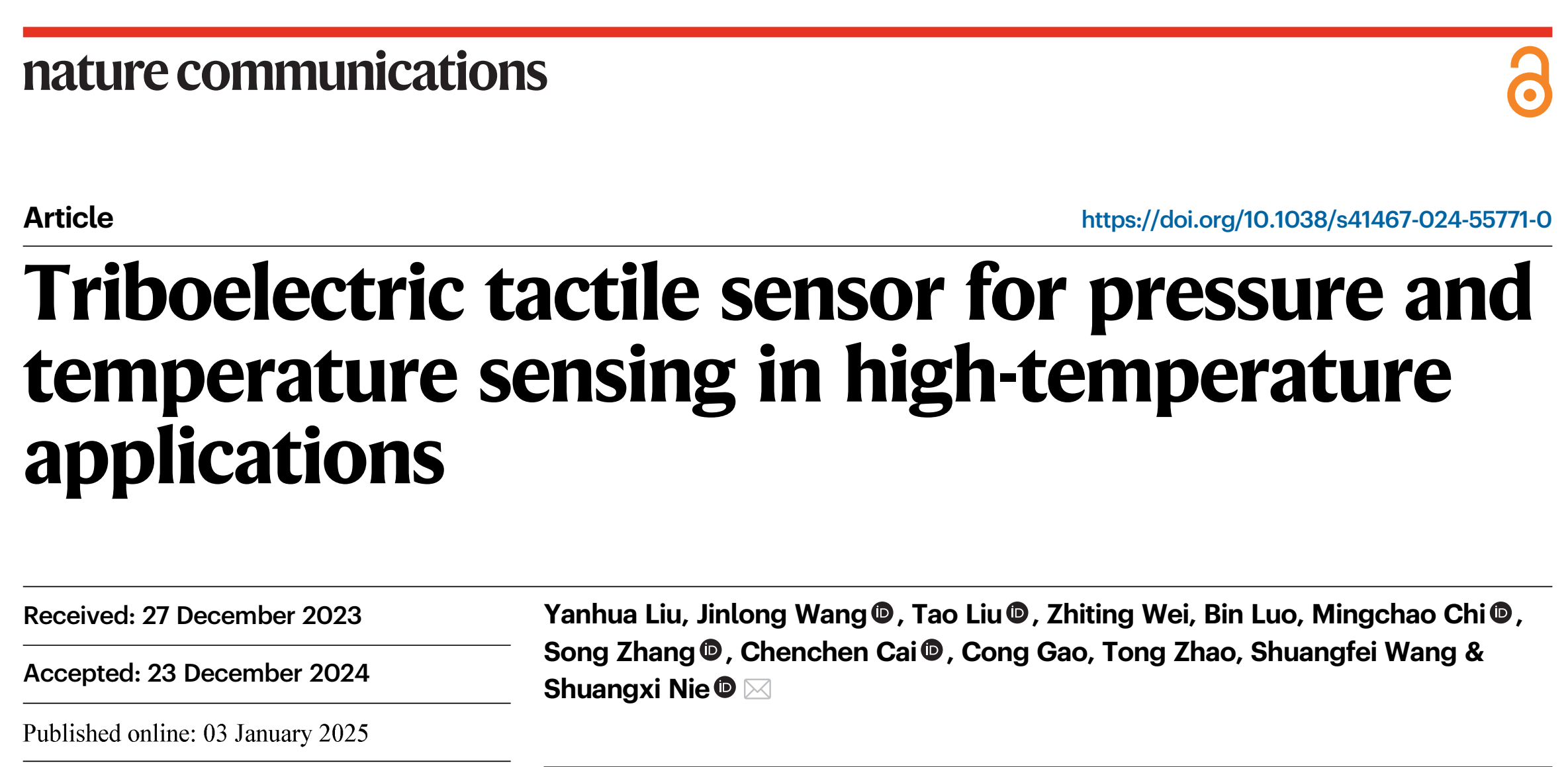 Recently, the group of “Advanced Wood Fiber Materials” in the School of Light Industry and Food Engineering of the University has made great progress in the field of paper-based functional materials, and the research results have been published in the top international academic journal Nature Communications under the title of “Triboelectric tactile sensor for pressure and temperature sensing in high-temperature applications”. The first author of the paper is Liu Yanhua, a PhD student of the class of 2022, and the corresponding author is Nie Shuangxi, a professor of the School of Light Industry and Food Engineering. Guangxi University is the only completion unit of the paper.