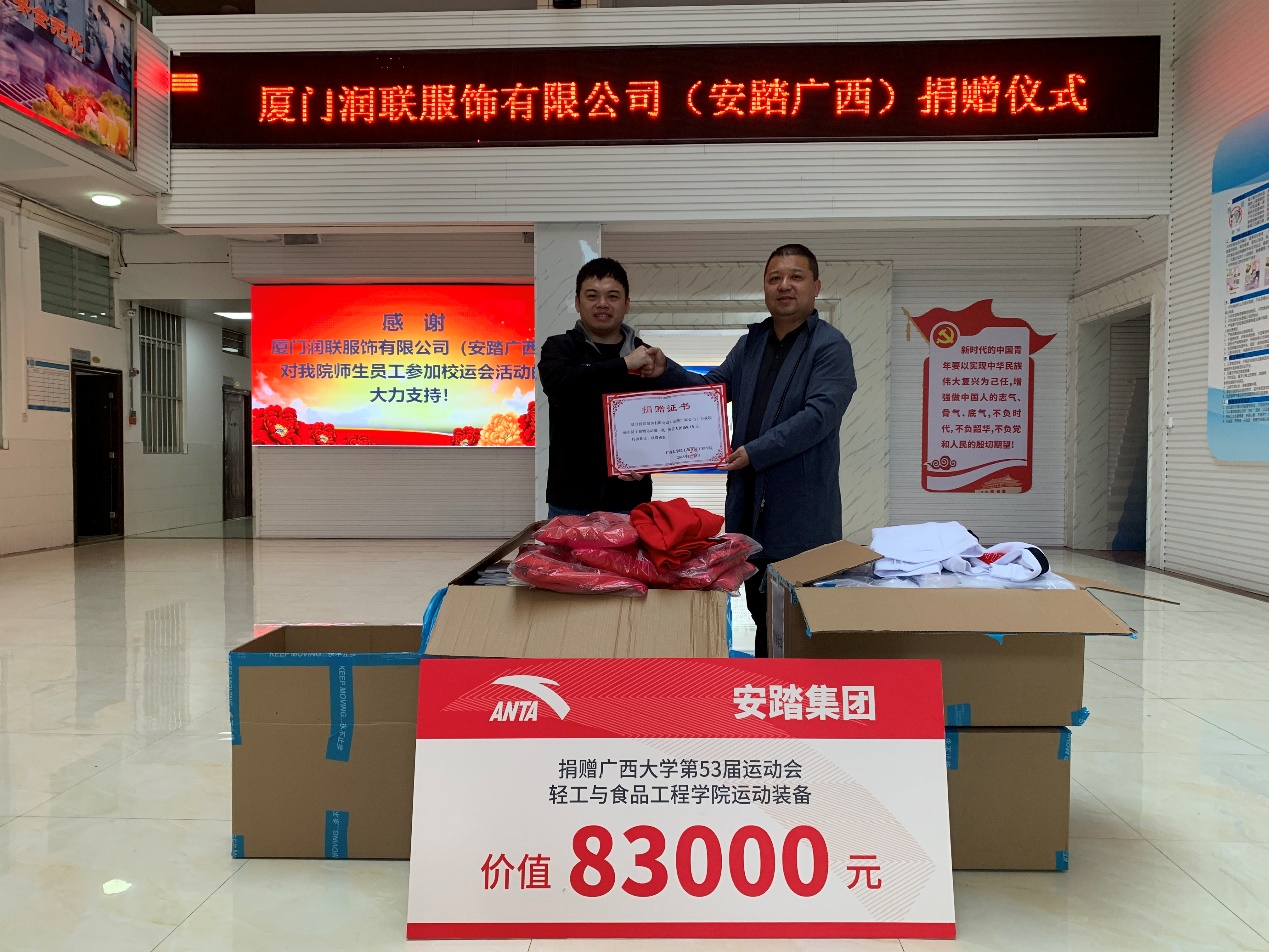 为弘扬体育运动精神,激发师生昂扬斗志,12月6日下午,在广西大学第53届运动会来临之际,厦门润联服饰有限公司(安踏广西公司)向澳门永利皇宫