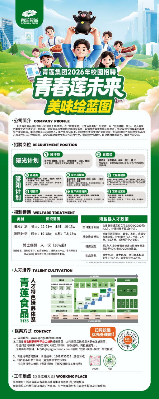 亲爱的同学们,青莲食品将于10月17日(周五)下午15:00在动物科学技术澳门永利皇宫 318报告厅举办广西大学专场招聘宣讲会,本次招聘聚焦食品质量工程师、品控、研发、育种、兽医、机械工程师、人事、财务、生产和市场等岗位,具体信息见招聘简章,线下投递简历优先筛选!宣讲会现场更有各种零食试吃和礼品赠送!