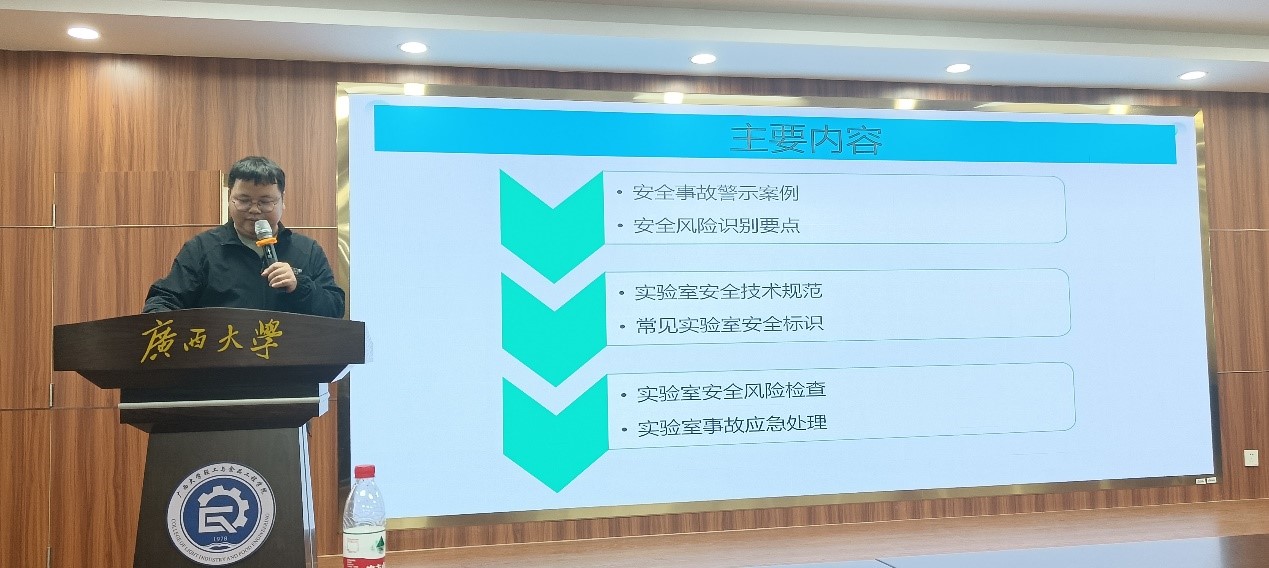实验中心邀请了广西壮族自治区产品质量检验研究院高级工程师陈德翼,开展了题为《实验室安全风险识别及应急处理》的安全教育培训。培训会由澳门永利皇宫
