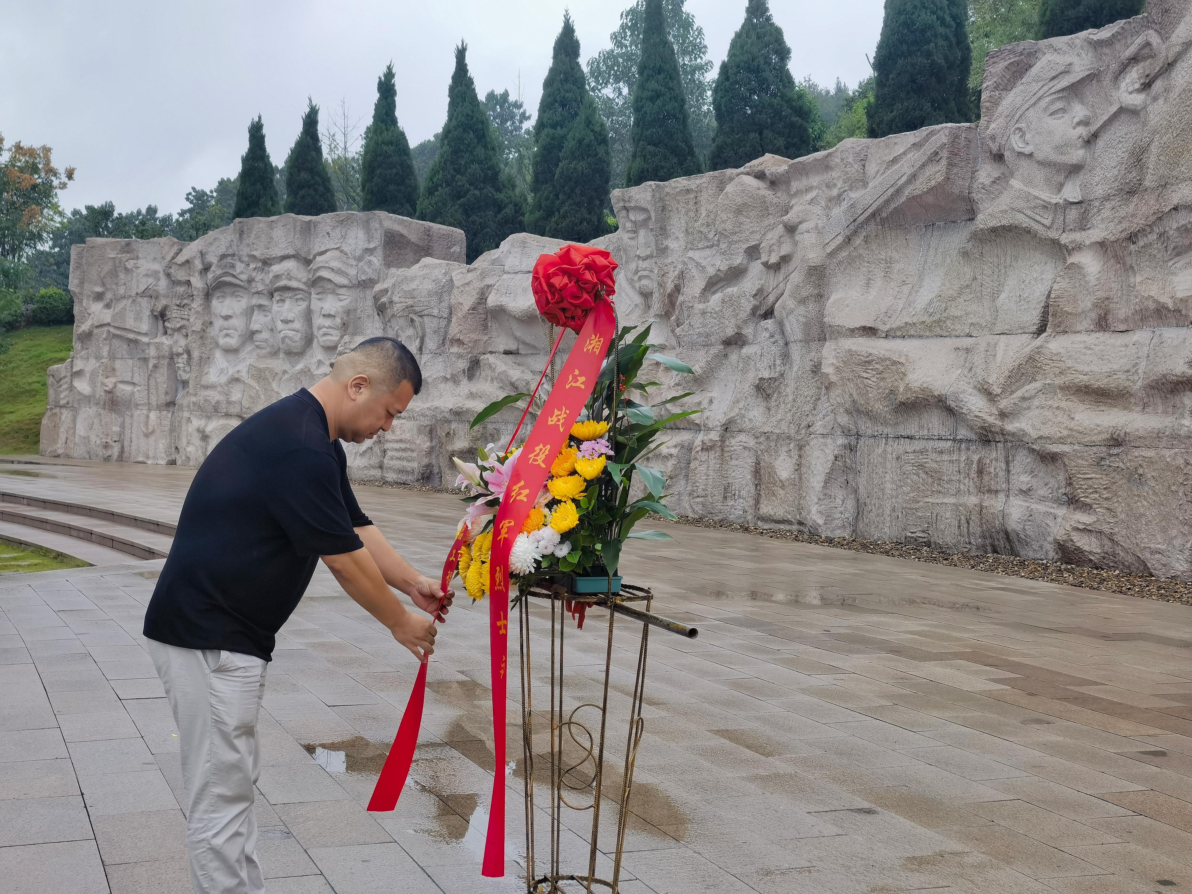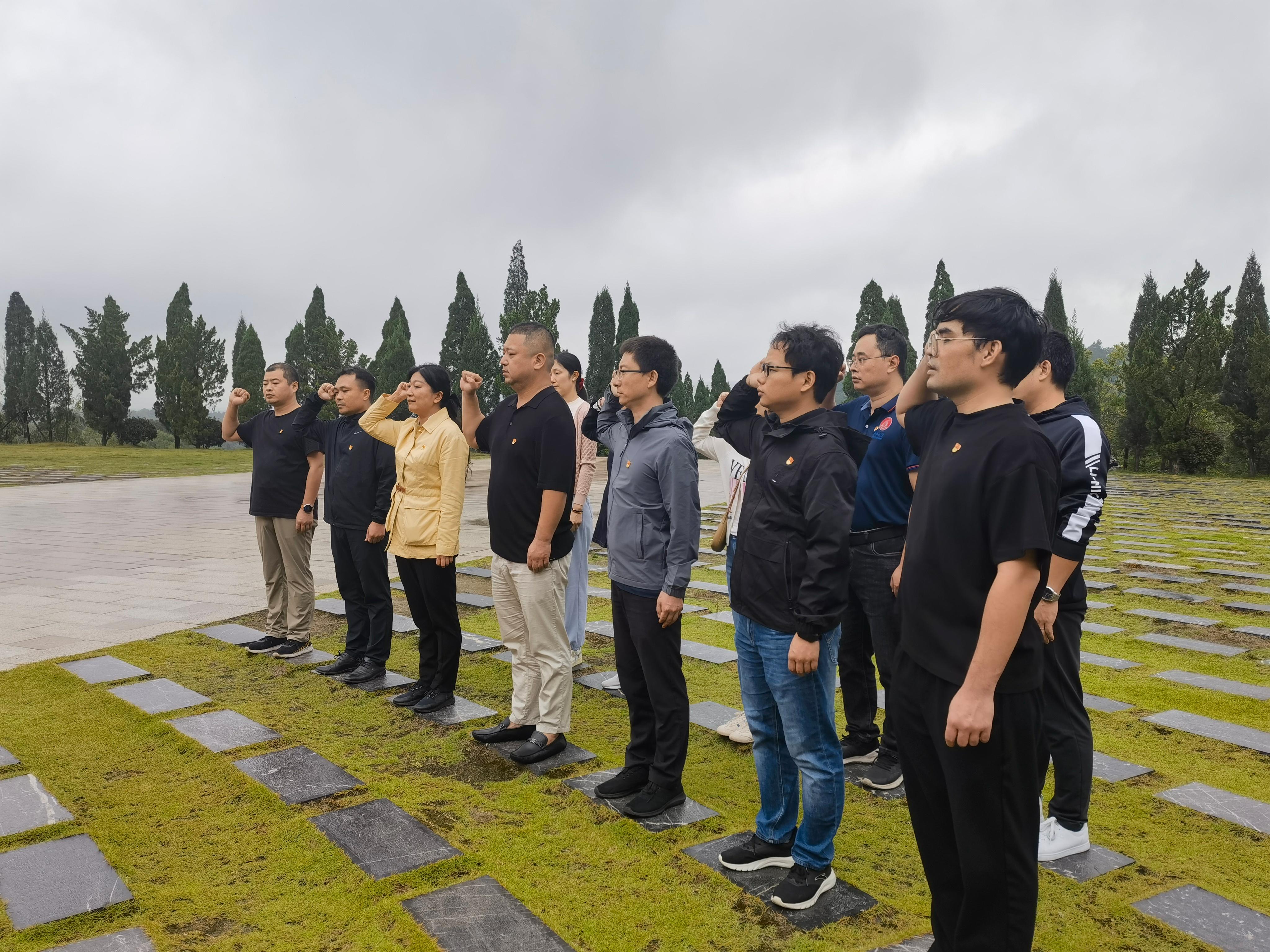 从纪念馆出来,全体学员徒步前往纪念陵园,在凭吊广场举行了庄严的祭奠仪式。姜玮代表全体学员向革命先烈们敬献花篮,随后全体人员鞠躬默哀,致敬英烈军魂。