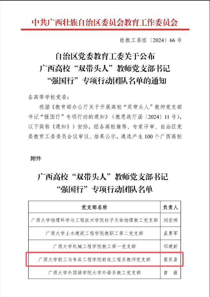 轻化工程系教师党支部入选广西高校“双带头人”教师党支部书记“强国行”专项行动团队。