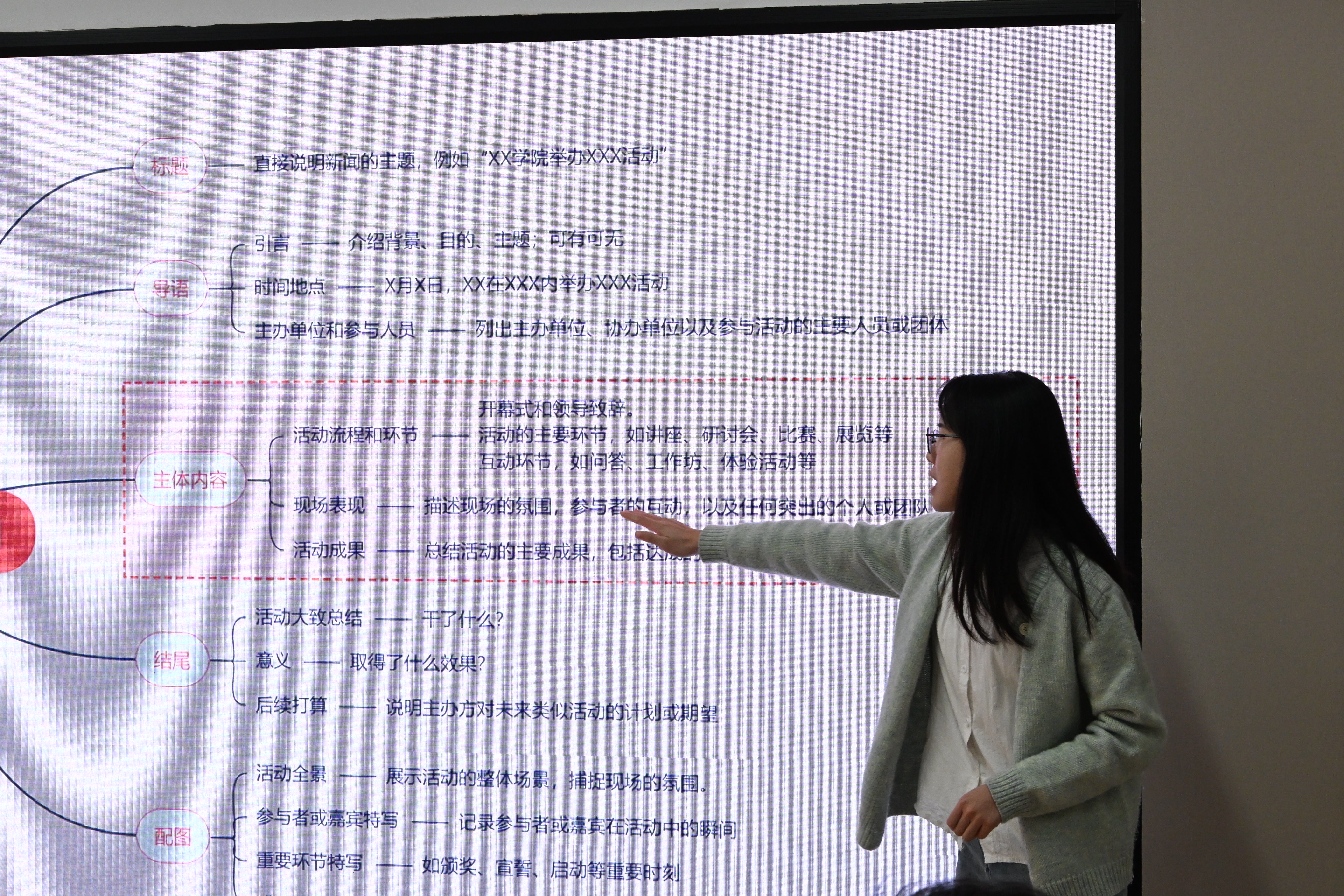 在培训过程中,李路怡从新闻的基本知识入手,介绍新闻的定义、要素和结构,强调“5W1H”在新闻写作中的重要性。随后,她按照校园新闻稿的常见类别,分享具体的写作思路与方法,为骨干们提供清晰的写作指引。她还选取了部分澳门永利皇宫