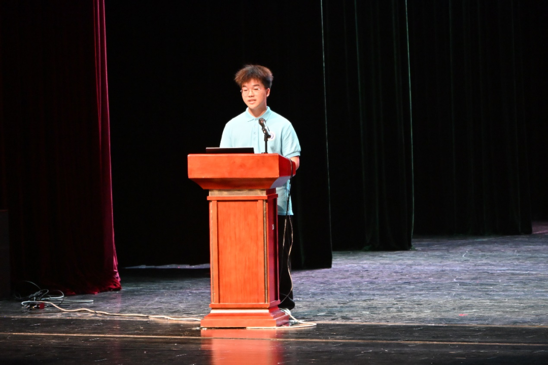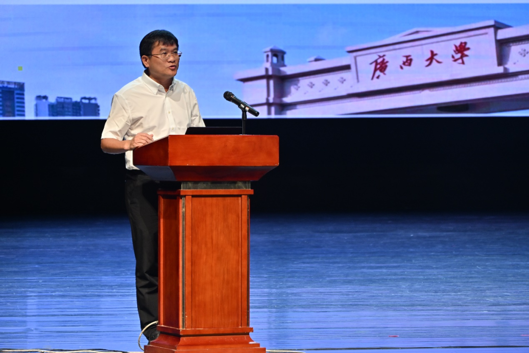 庄严的国歌旋律拉开仪式序幕,点燃现场氛围。轻工252班邓博作为新生代表发言,他分享了自己因驻村书记与广西大学结缘的故事,表示以“西大轻工人”为荣,融入八桂热土,锤炼本领,服务家乡;愿与同学们并肩,传承“锄头主义”“三拼精神”,书写新时代青春答卷。