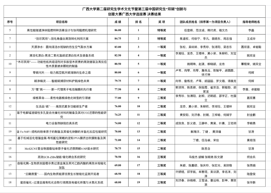 经工作人员统计后,现场公布各团队的成绩。广西大学第二届研究生学术文化节暨第三届中国研究生“双碳”创新与创意大赛广西大学选拔赛决赛结果如下: